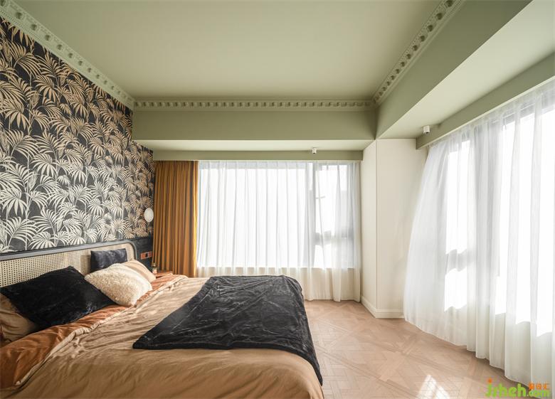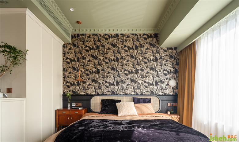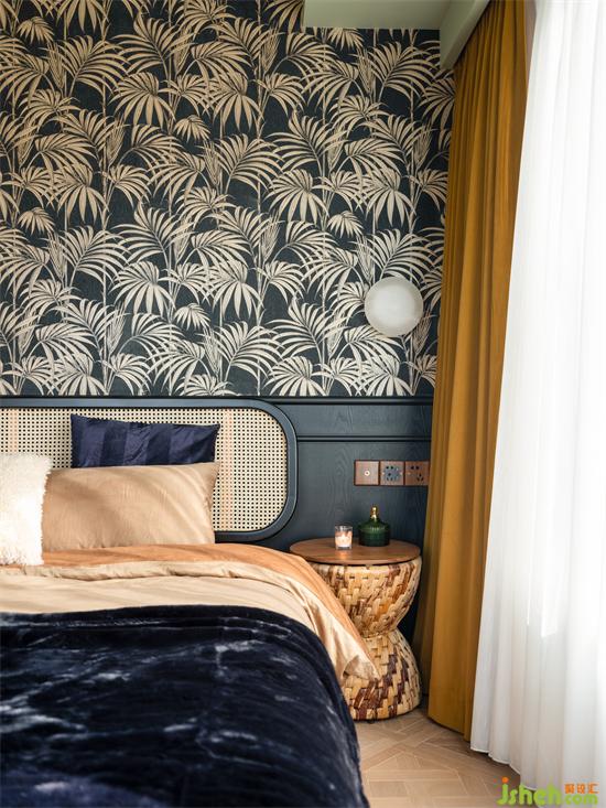 睡眠空间用色更加跳脱大胆,南洋风不可缺少的清凉与热烈由墙至顶大面积渲染,床头背景采用黑白相间的棕榈叶装饰壁纸,抹茶绿铺陈天花,具象的绿意与梦幻的香薰装点其中,为空间注入大自然的生机以及探索的神秘感。