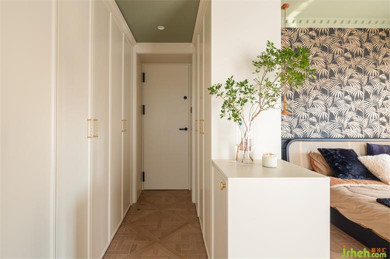 由收纳柜体代替装饰与空间分隔,空间释放实用功能和动线。转角半高柜子弱化生硬转角,增加叠放收拾的操作平台,摆件与植栽又可添一处过渡端景。