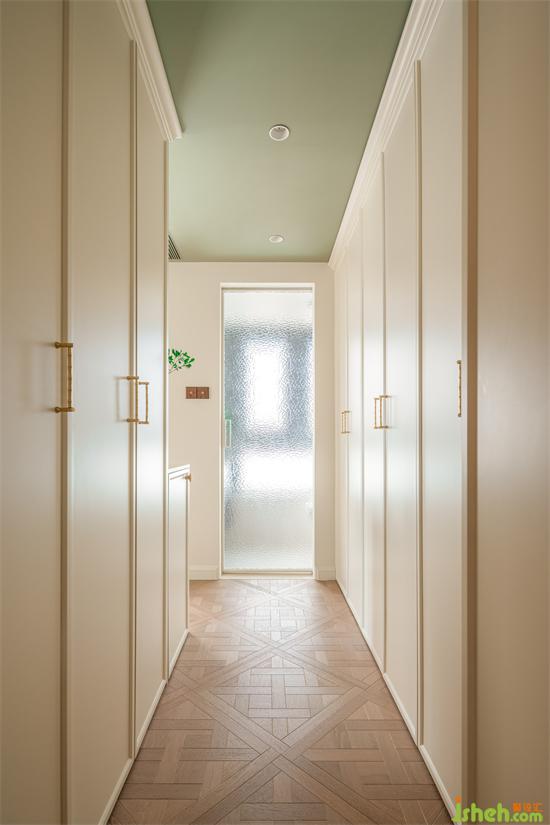 主卫推门采用水波纹玻璃,自带复古氛围感,干净清爽也易打理,海纳公馆家装设计即使在房门打开过道对着公共空间的时候也能带来油画般的视觉感受。