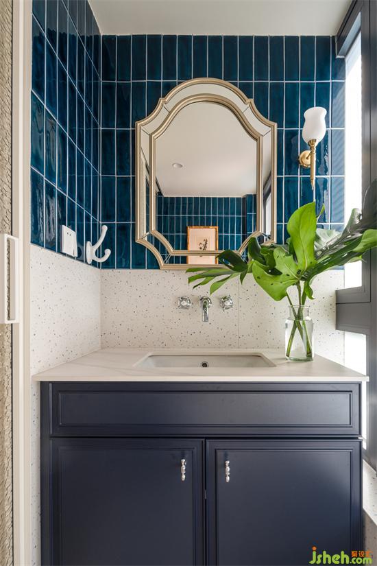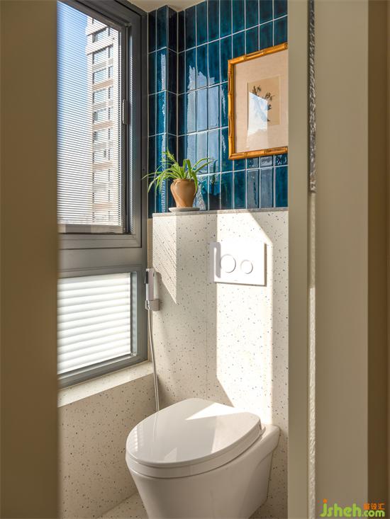 蓝色系花砖与水磨石铺陈的主卫空间浓郁又清爽,两分离布置实现日常的简洁高效。
