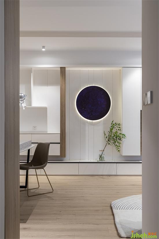 厨房开了灯的光影反射在玄关空间,散落不规则柔和块面无形拉开了有限的玄关尺度,深圳豪峰园家装设计不同视觉感的白呈现包容与柔软,为入门归家增添一份浓烈仪式感。