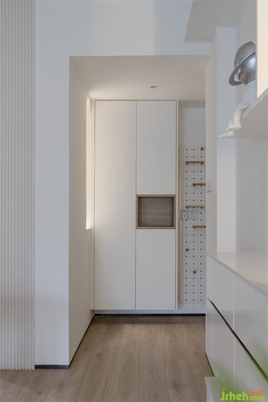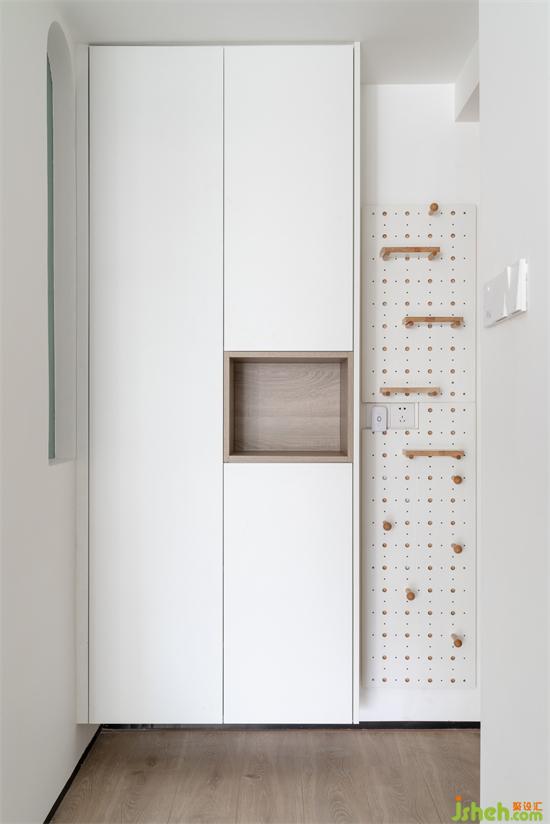 ▶考虑厨房的使用频率和重要性保证其空间尺度能满足高效的u型橱柜布置,进门玄关没有借用其空间,而是靠门垛处做了一组鞋柜结合洞洞板的形式,满足进出门的收纳和实用需求。