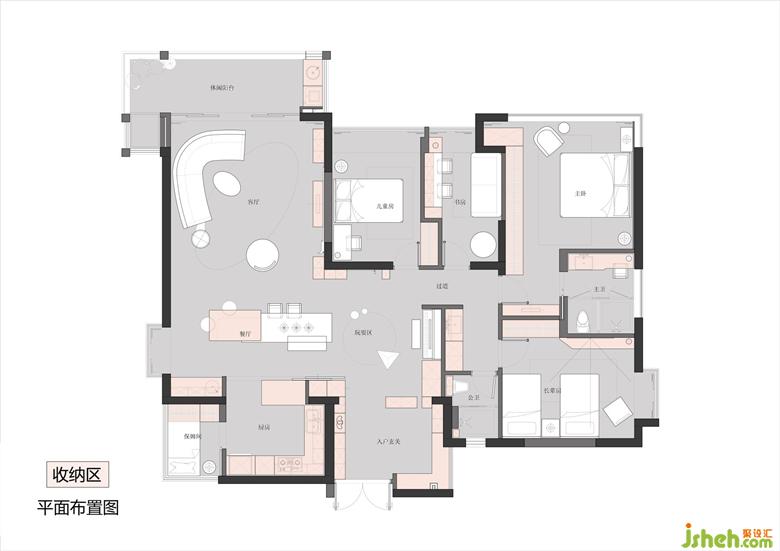 3.空间上平衡功能与美学,融合功能与结构,弱化超大体量需求。分区设置家庭成员不同和共同的功能收纳需求,从而让生活更简单舒适。