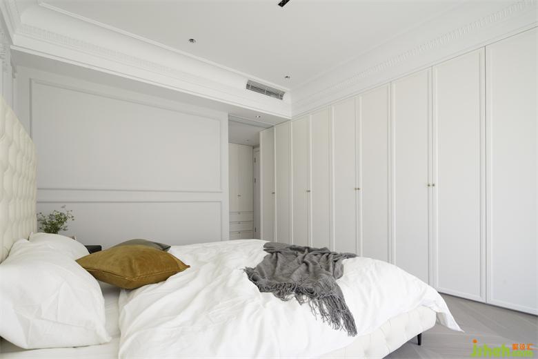 一门到顶的衣柜从床尾的落地窗处延墙设置至进门凹位,南山兰溪谷家装设计将近15个平方的收纳空间,无形增加一个衣帽间,满足Anna的精致时尚收纳。