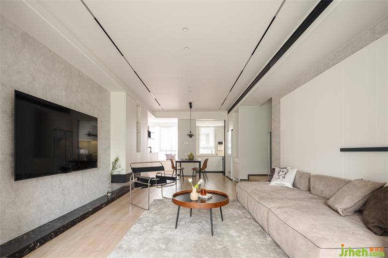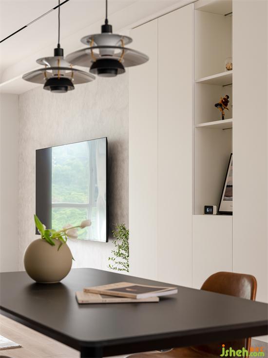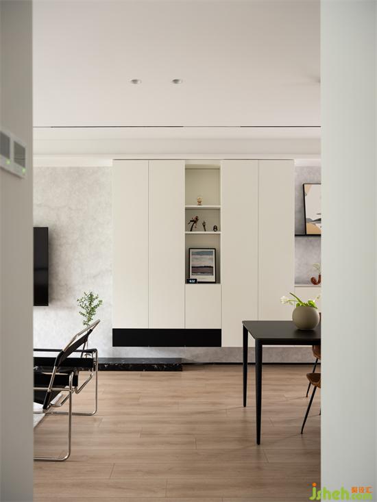 山居岁月家装设计考虑开间尺度,保留舒适的视听距离和感受,电视背景没有延续满墙收纳,涂刷水泥艺术涂料增加背景层次感。10公分高的黑色大理石地台隐藏插座电线,形成3米多的低矮平台向下收纳,放影音设备或其他展示物品。