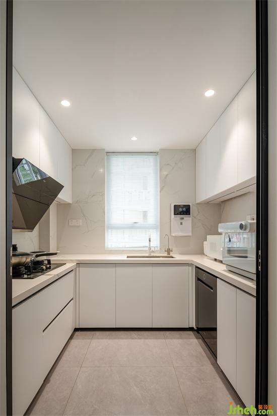 高效合理的U型厨房布局配备完善的五金功能,山居岁月家装设计以及符合操作习惯的高低台面让使用者更轻松舒适。