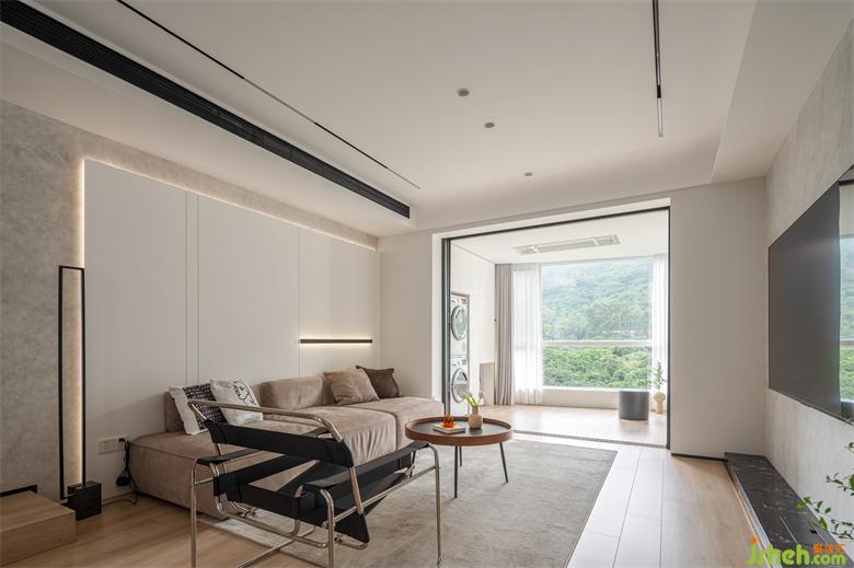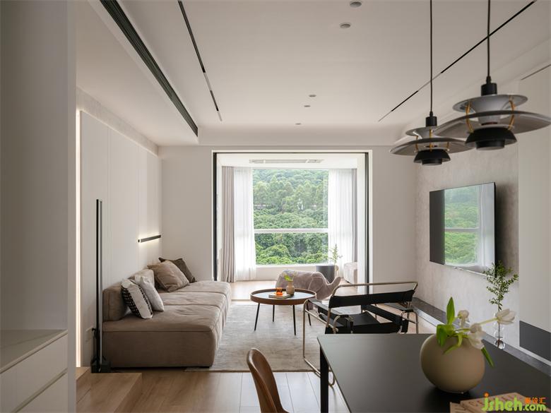 阳台封窗纳入公共区引进疗愈山景,内部空间以极简内敛基调给与居住者更自由且丰富的精神想象。