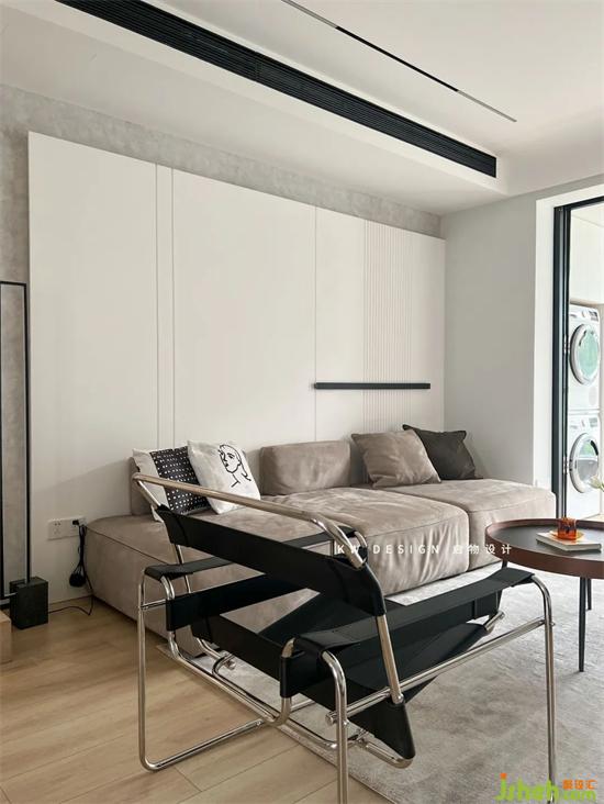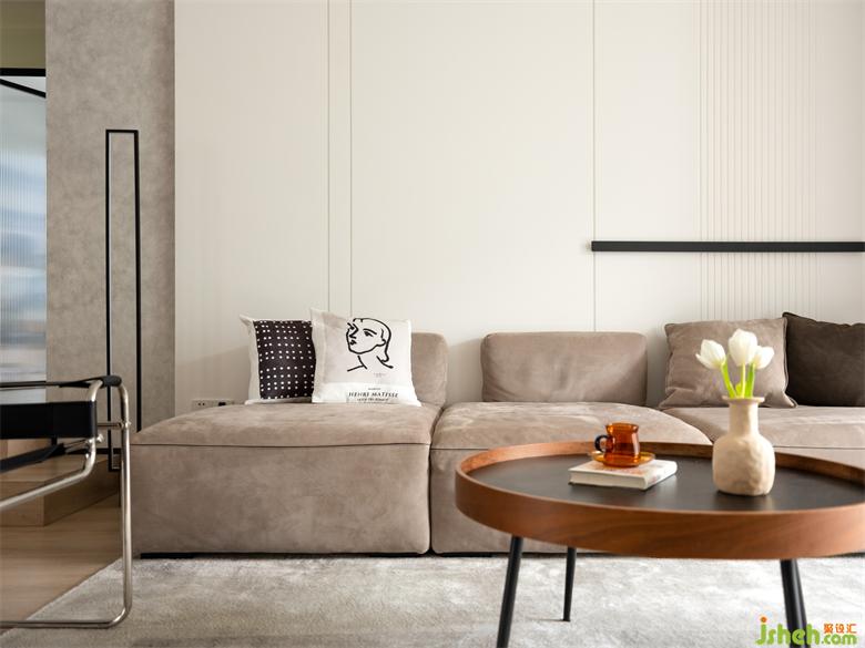 山居岁月家装设计白色线条格栅造型与不规则艺术肌理墙面的错落布置简约立体沙发背景,线性灯源和流畅形体的功能家居围合休闲领域,简单几何形态贯穿均衡统一的形式美学语汇。