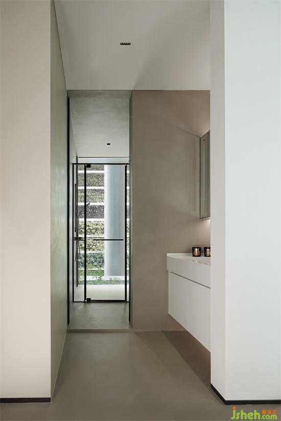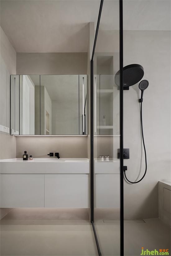 邻建筑群的一面是小区阶梯式垂直绿化,开阔的格局为室内引入不同的治愈景观,海府壹号家装设计微水泥通刷的三分离卫浴空间尽显简约质感和格调。