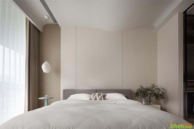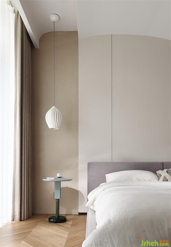 延续纯粹与极简,由微水泥与艺术涂料装饰床头背景,色感清甜,既有侘寂的自然素雅又有奶油般的温柔精致。