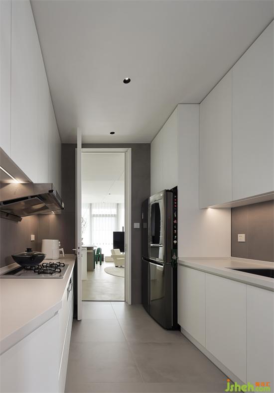 中西厨分离,海府壹号家装设计为居住者的休闲生活提供了更多的便利,厨房双一字型布局留出通往阳台的过道,动线简单功能清晰。
