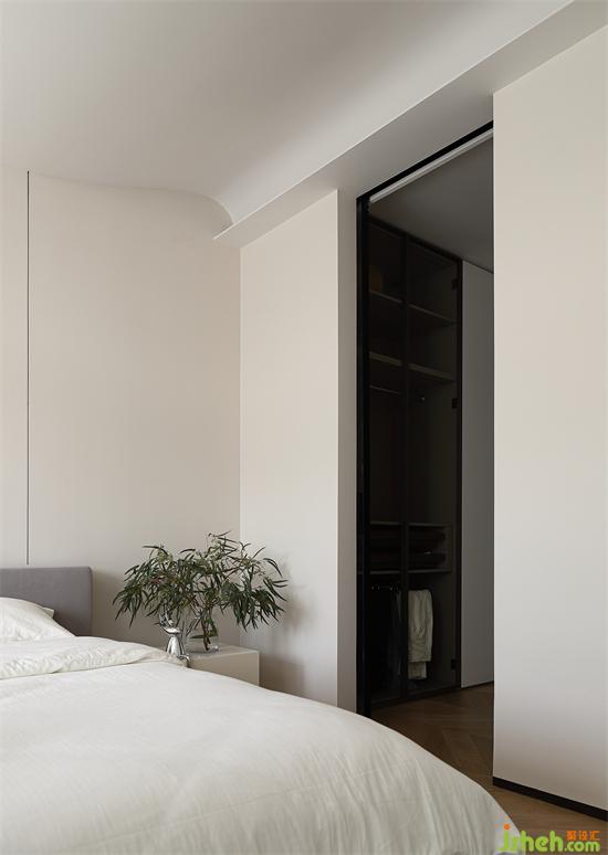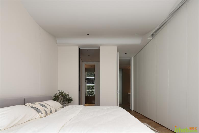 窄边框移门过渡分隔空间,保证睡眠区的独立私密和卧室套间的高效使用,海府壹号家装设计内部收纳预留黑框灰玻和全镜面柜门,方便日常使用。