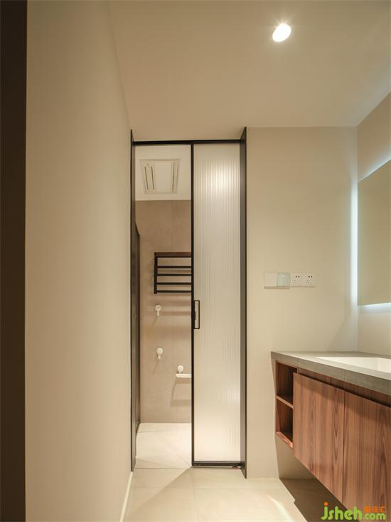 公卫干湿分离提高使用效率,家装设计在洗手台另一侧做薄墙嵌入收纳壁龛,释放清爽洗漱区。