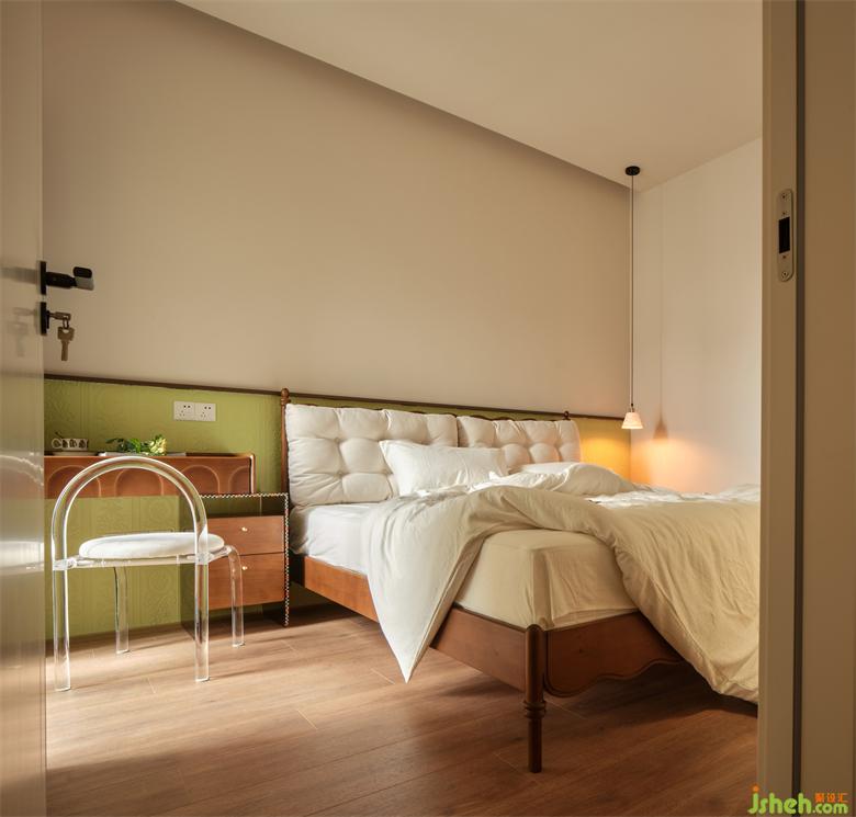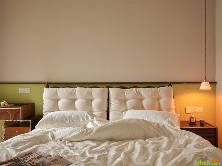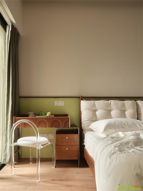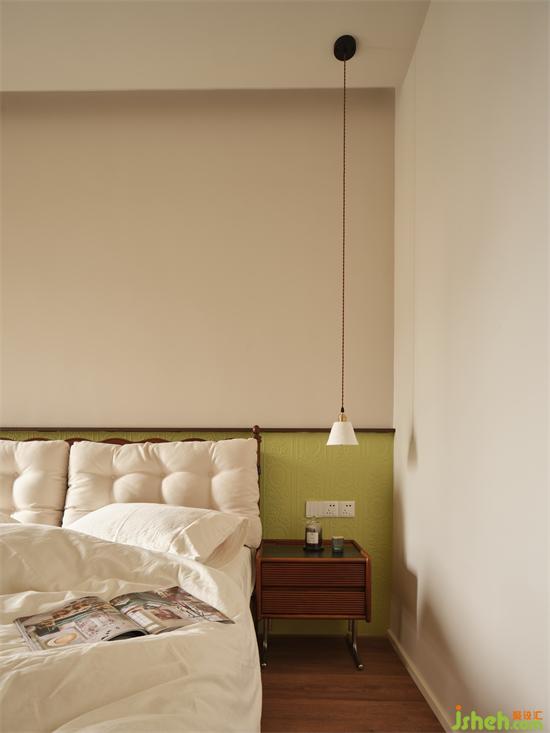 卧室床头采用半高的浅绿色海基布作背景装饰,瀚海东岸家装设计古典花纹与其浮雕质感与为奶油轻复古空间注入时尚精致家居感,清新淡雅又别具一格。