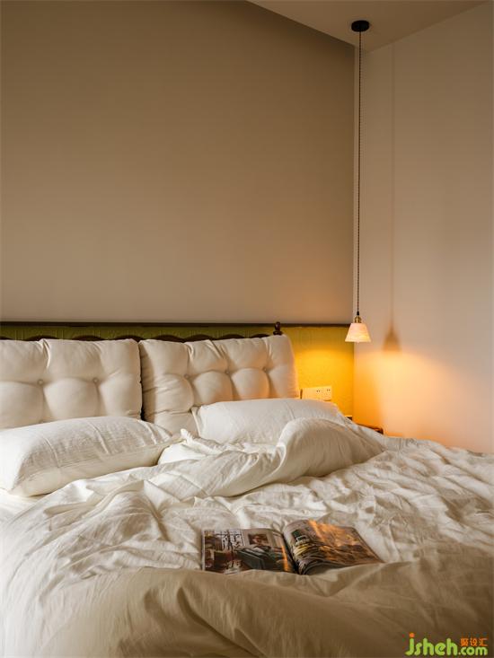 床头陶瓷吊灯小巧精致,半透光的渐变厚度在暖黄灯源的映衬下产生群山叠影的层次变化,瀚海东岸家装设计满满的意境和氛围感。