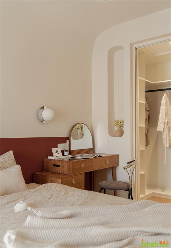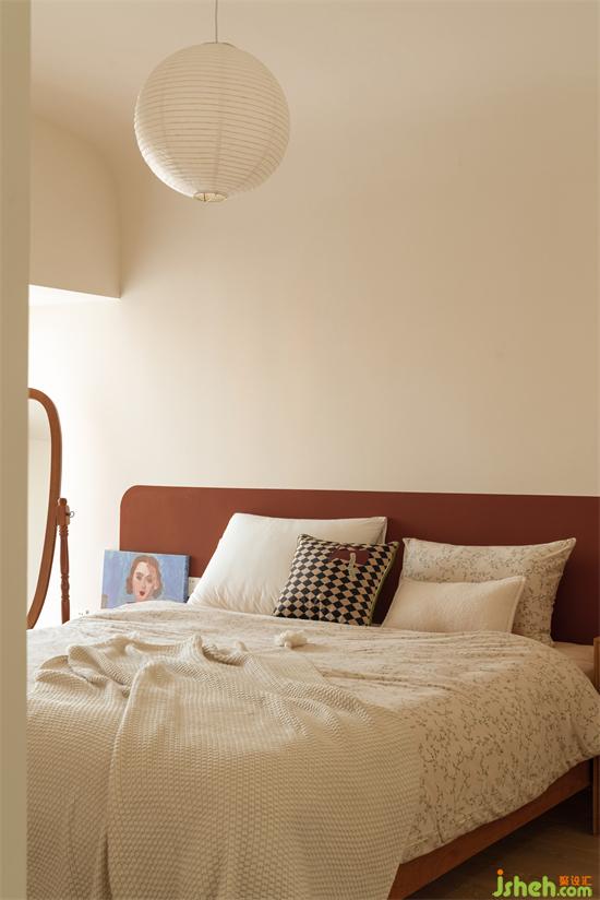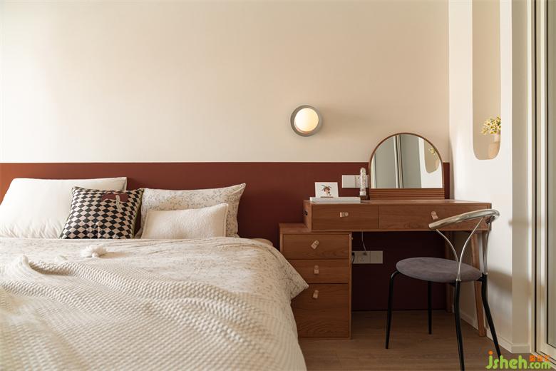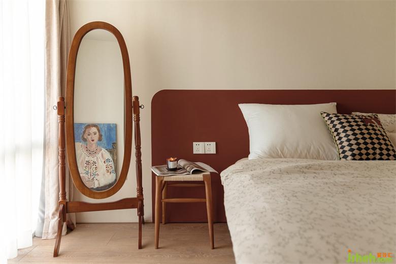 卧室空间没有累赘的床头背景,以半墙的红棕分色作装饰,家装设计点缀复古奶油空间。