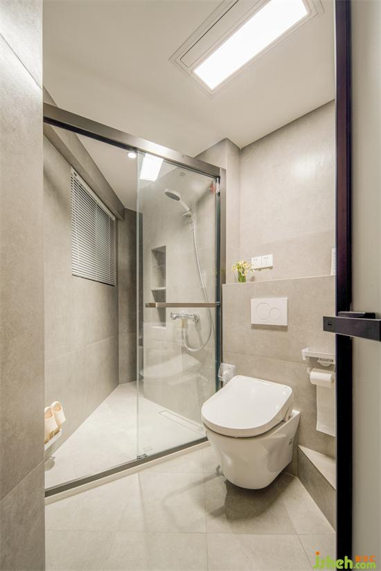 厨卫皆是简洁好打理的大灰砖铺陈。家装设计淋浴间的异型凹角留置热水器以及各种清洁用具的收纳。