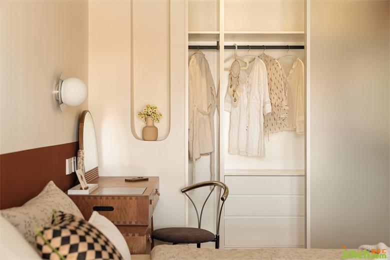 步入式衣帽间采用了白色磨砂推门,光影变动的朦胧质感梦幻美妙。