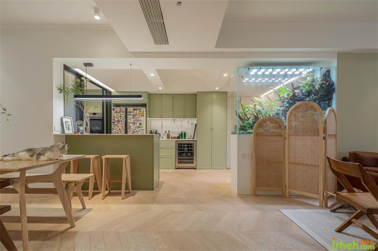 师法自然,融于自然,顺应自然,表现自然...提炼有机生命的自然形态和绿意,由质朴原木色贯穿全屋点缀清新抹茶绿,藉由开放格局和光源营造有呼吸感的森系氧吧住宅。