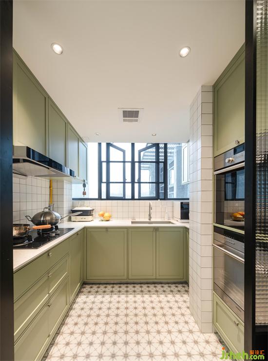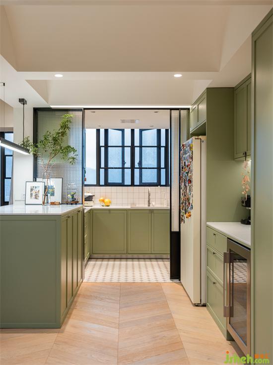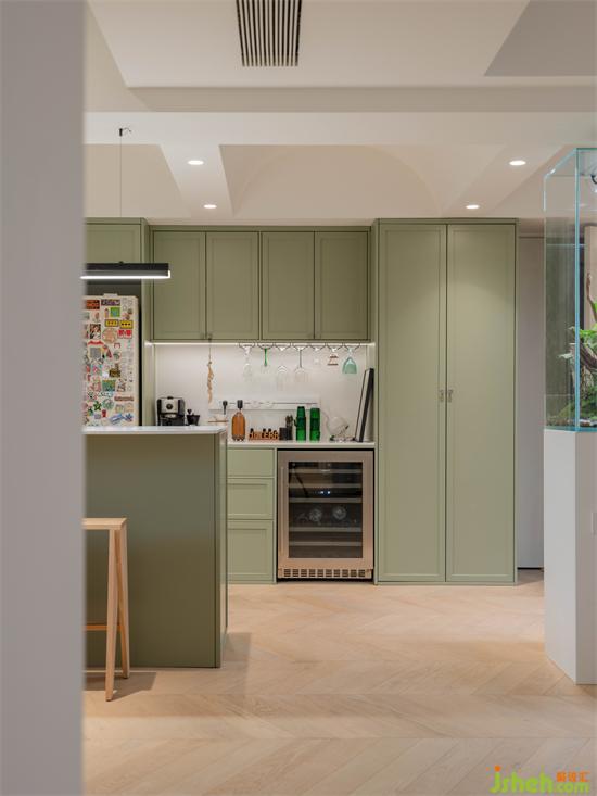 Germany对家里每样东西都要求细致完美,同样作为设计师,在柜门的形体设计上,注重立体尺寸和造型层次,要求在每个单元柜之间增加两公分的收口条以达到更丰富的立体美感。拉手也是亲自挑选的拉丝古银做旧款,和绿色柜门搭配复古精致。