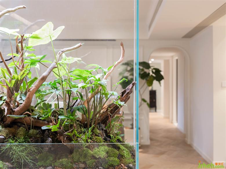 3. Germany希望有个惊艳的门厅,通透有层次的。家装设计连接茶室做了一组半高的杂物柜上面设置Germany喜欢的生态缸作为玄关端景,避免门对厅的冲突同时也放大了客厅沙发背景的空间比例。