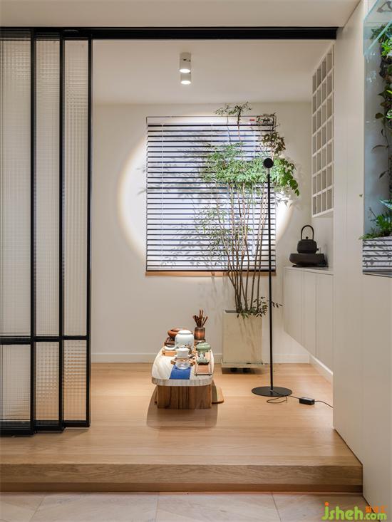 家装设计由落日灯与绿植投射在百叶上虚实相间的光影效果营造“前庭”的静谧清致氛围。在闹市得一净地,拾级而上,席地而坐,品茶道高阔论,如此闲情逸致令人艳羡。
