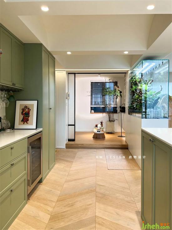 4. 进门左边预留鞋柜连接西厨的餐边柜和冰箱,靠内的中厨空间预留推拉门可封闭可开放,再由兼吧台功能的操作岛台连接餐厅,实现利用率和仪式感满满的烟火区。