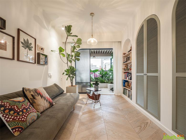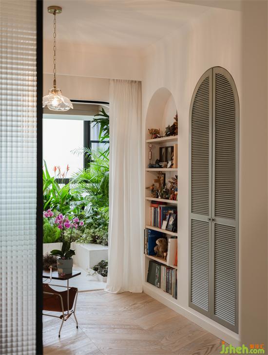 墙体的不规则结构由收纳展示区平整连接,薄区设层板架展示纪念品和常用书籍,深区域保留柜门收纳日用品和杂物,家装设计拱形百叶门为功能墙面增添复古艺术气息。