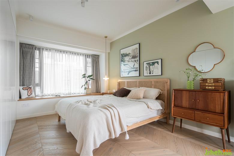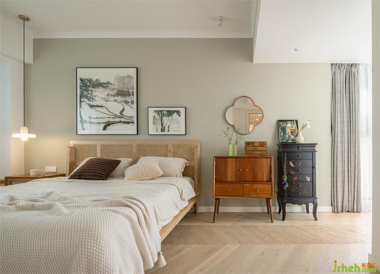 藉由家居单品来展示空间魅力和主人气质。藤编床榻与亚麻床品铺展睡眠区,家装设计中古撞色斗柜组合搭配梅花镜花梨首饰盒装点女主人的精致日常。