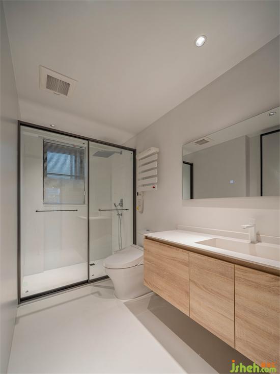 为了保证整体风格的统一同时减少拆除工作和预算成本,卫生间原墙地面砖上覆盖了微水泥,家装设计更换吊顶和五金配件,实现简单清爽的卫浴空间。