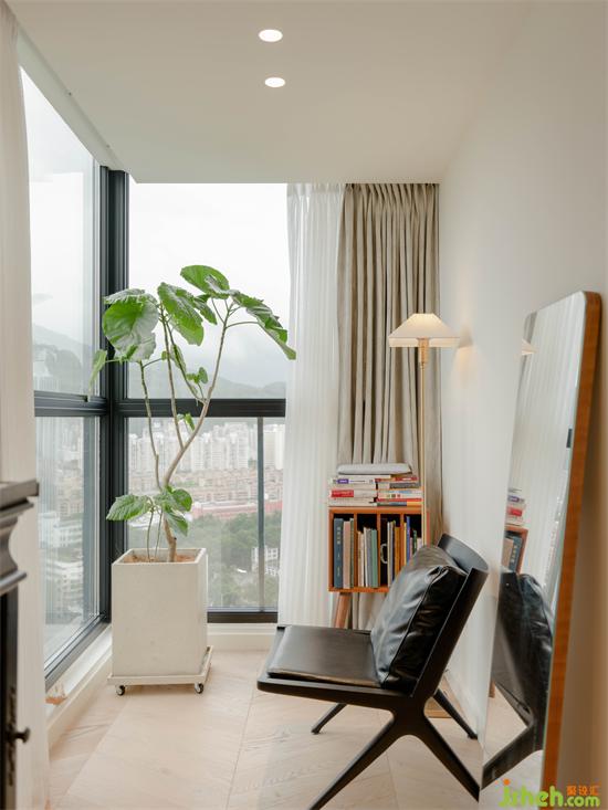 阳台紧邻交通要道更换防尘降噪的落地铝窗,引入塘朗山的开阔绿意,于休憩区设一处休闲阅读角,任思绪放空或飞扬在城市山林间,悠然无限。