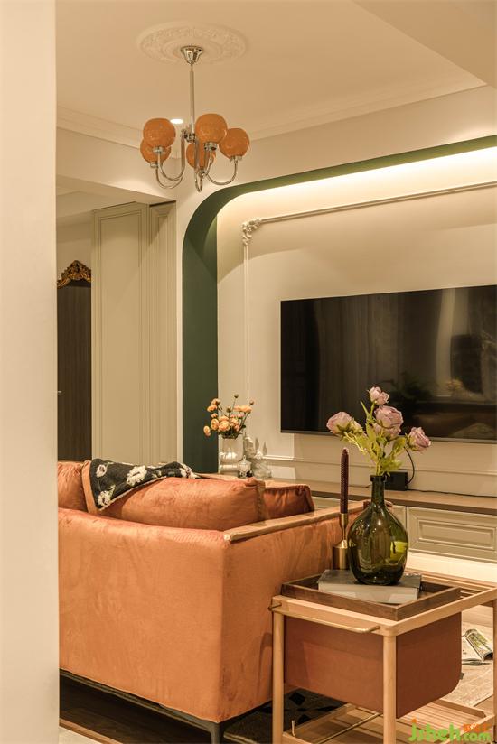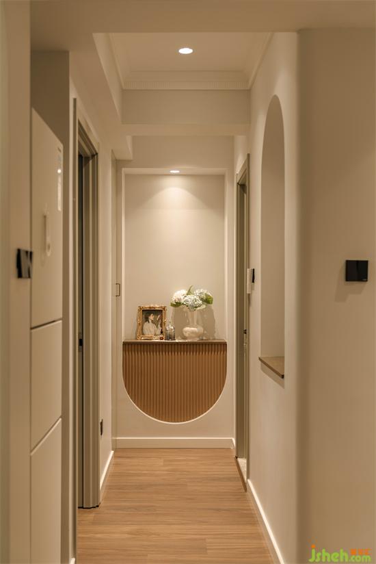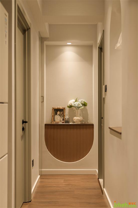过道尽头在倒置的拱门造型里嵌入焦糖色格栅面,摆上琳琅满目的物件和花卉,又是一处美的端景。怡枫园家装设计兼具美观的同时左边还内嵌了一组收纳柜做日常储物。