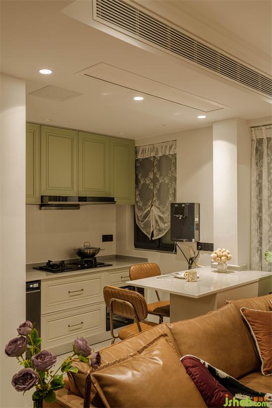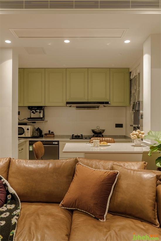 厨房靠过道侧开了一扇拱形门洞,增加空间的互动和趣味性。
