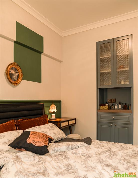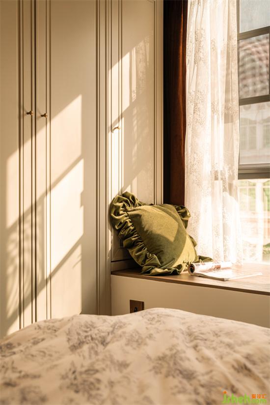 飘窗台贴上温润木板,成就一处可倚可卧的休闲地。透过花纹窗幔打在柜子上的光影也很美妙。