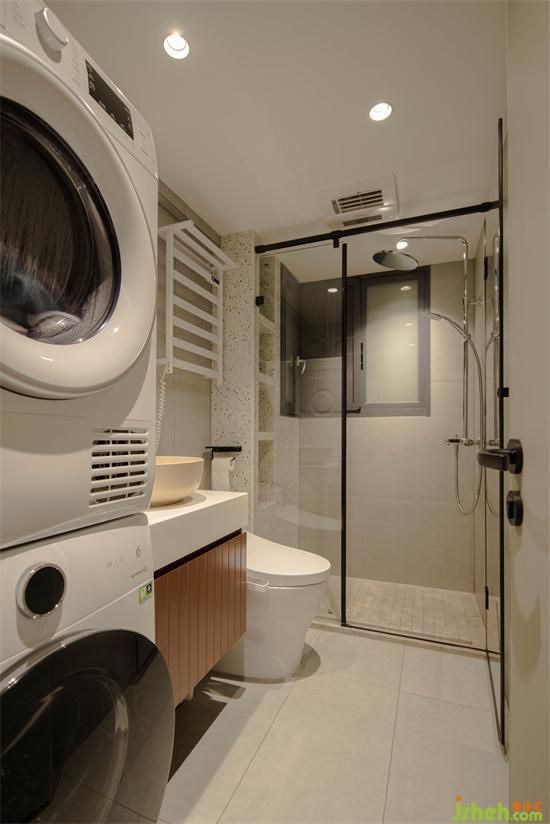 生活阳台不能封,考虑方便还是把烘洗机挪进卫生间,适当的压缩了淋浴和浴室柜的位置,之于MIA一个人使用完全足够的。一字型布局提供了高效的生活动线,所有洗浴功能皆可在这个空间完成。