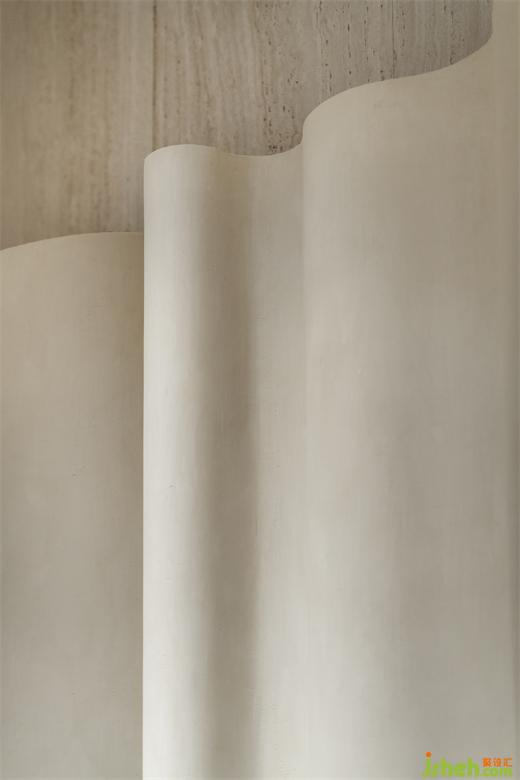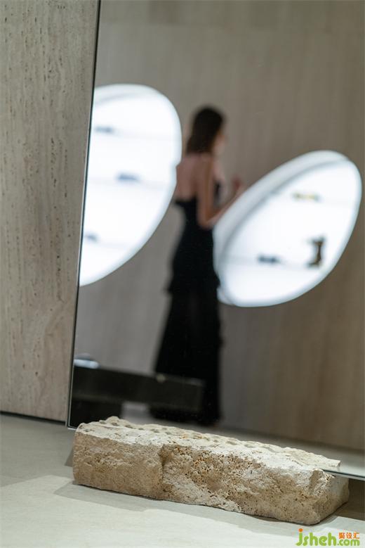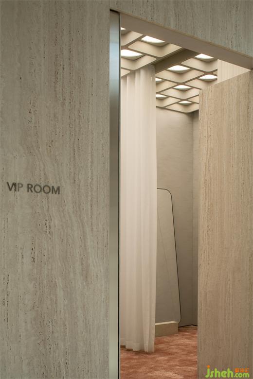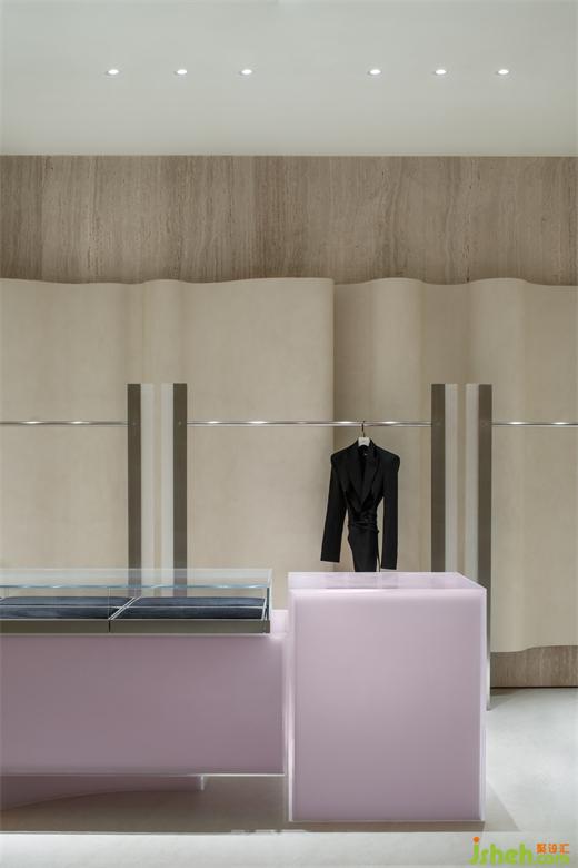 与试衣间一样延续空间统一的设计手法,展厅设计通过材质与光线的结合,为客人的试衣环节提供了舒适的场所,又能全面展示人与服装的相衬。