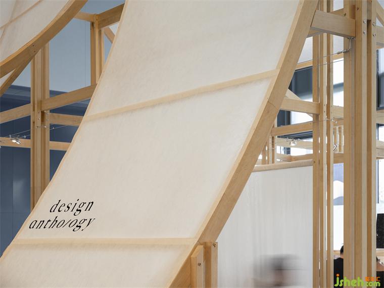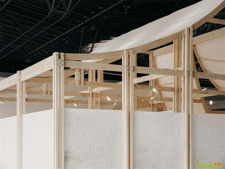 同时,在外表皮材料的选用上,上海展览设计以和纸作为主题呼应,由表及里包裹立面,内部以同样材质完成软隔断的设置,以此实现动静区域分隔。柔韧精巧、轻盈通透。