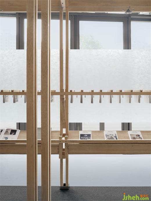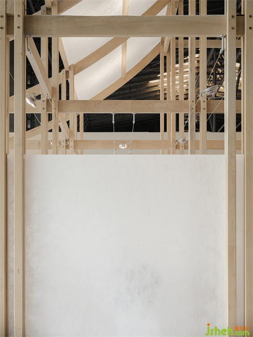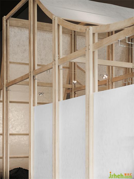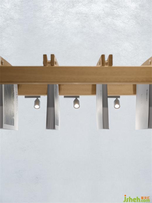 为配合本次建筑整体呈现出的轻盈与通透感,我们将常规悬挂式灯具以灯线代替,藏匿于木工凹槽中,搭配传统木工结构一并呈现,满足照明功能的同时,上海展览设计在空间细节部分起到装饰点缀效果。古今碰撞,传递当代设计语言之下的美感表达。