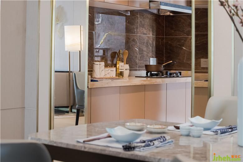 饭厅延续整体空间的色调,窗外透入的光线自然把窗帘的图案轻轻的影在桌子上,连贯着厨房带出了生活气息。