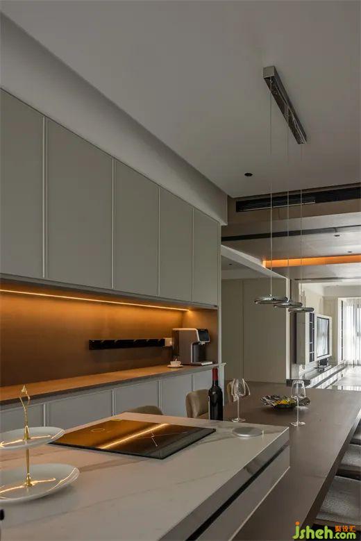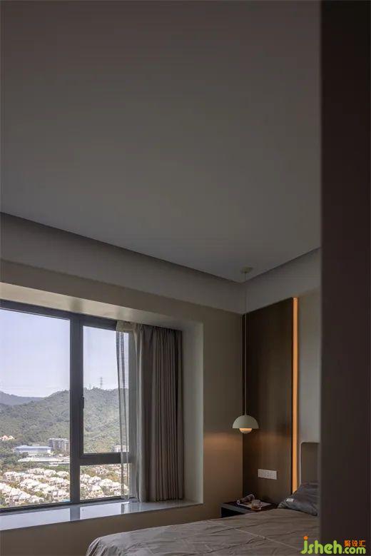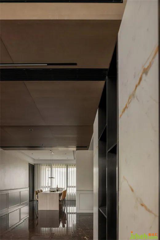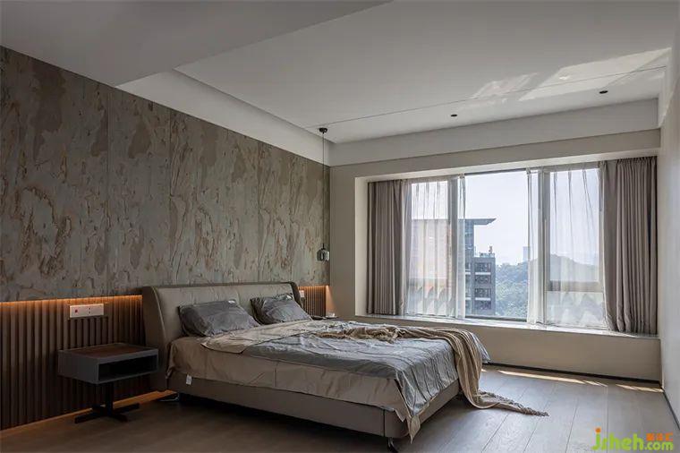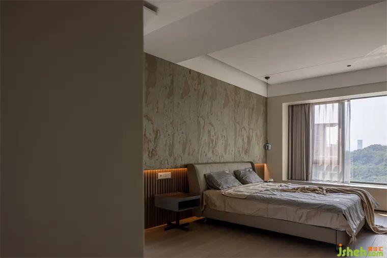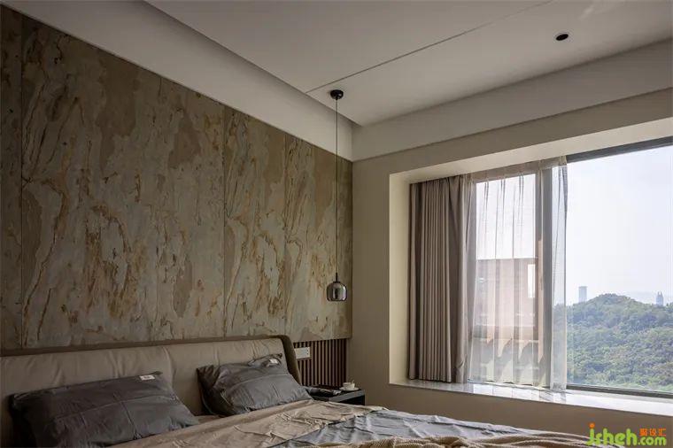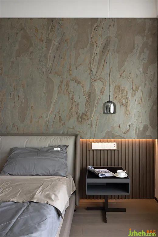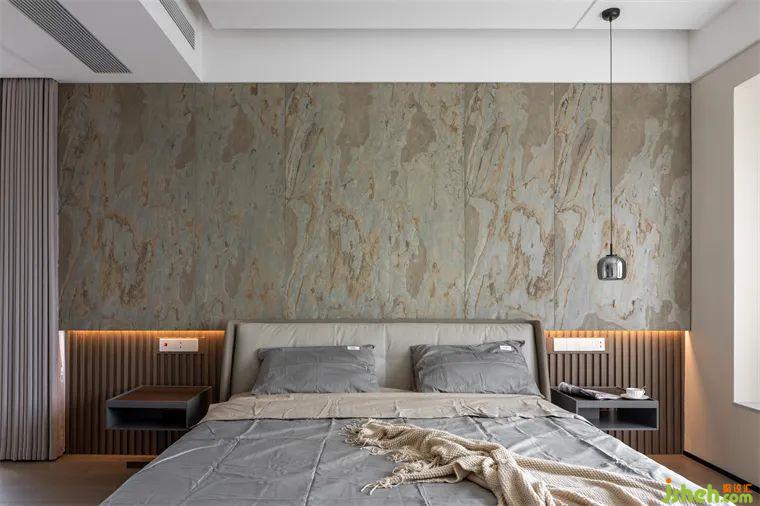 此外,卧室区域我们选用了一整面的岩板装饰,搭配银色金属吊灯,既保持了卧室舒适温馨的氛围感,又点亮了卧室的整体风格,简约而不失绮华,质朴又不失精致。