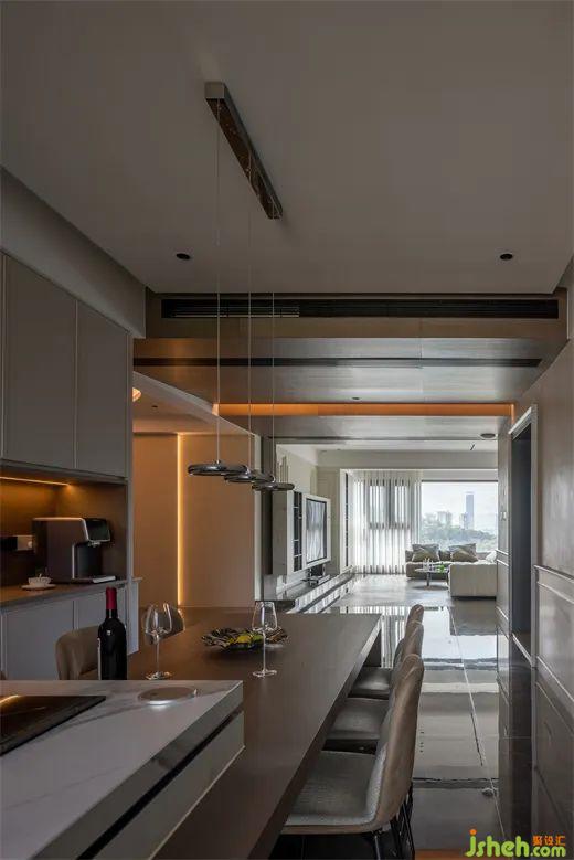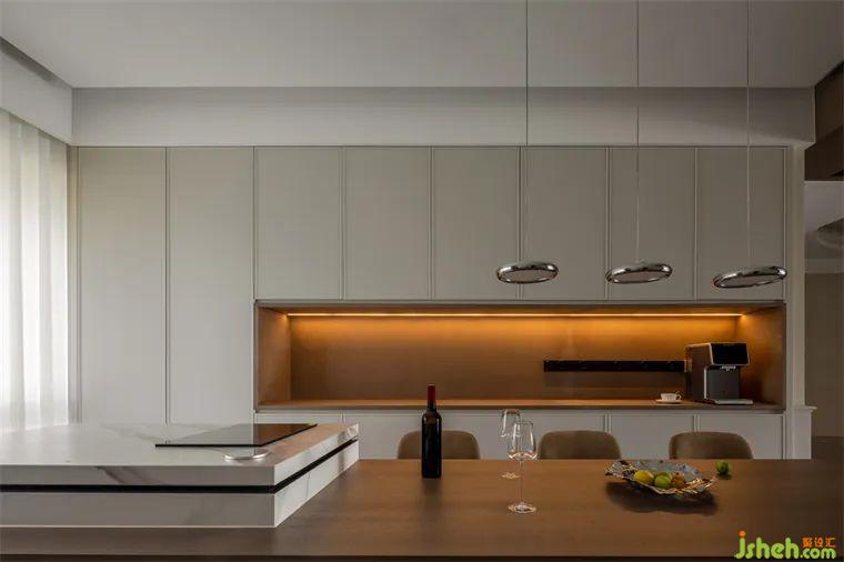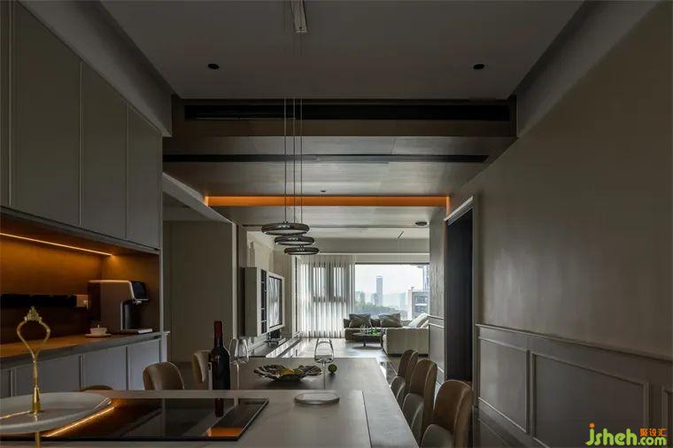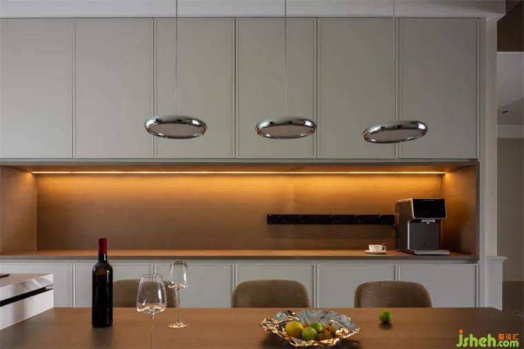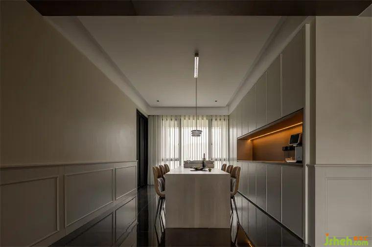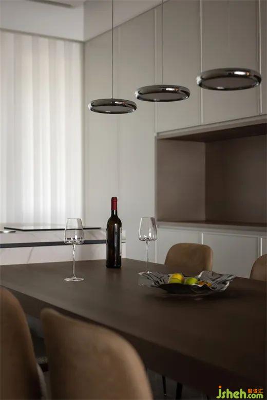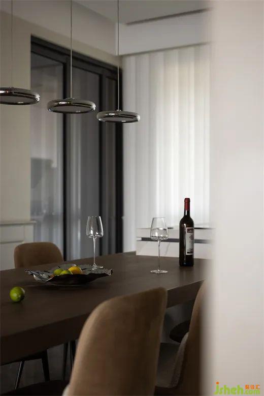 餐厅区域古朴柔和的木质桌板与悬空的金属吊灯相得益彰,在每个归家的夜晚,家人围坐此处品味人间烟火,共度温馨时光。