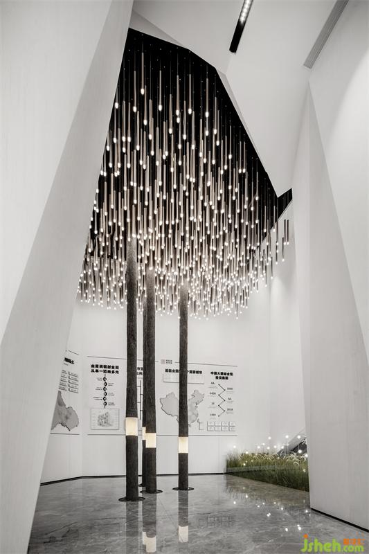 售楼处设计破除原有的固化,将前厅部分拆解为一个峡谷入口进入另一个空间连绵的新生。人与景相移,自然光线错落倾撒,空间的叙事感油然而生。大折面作为贯穿室内外的建筑体块,宛如一重帷幕缓缓展开。装置艺术品:“生命之树”源于对自然宽容的诠释,一隅自成天地,万物复苏,创造天地。