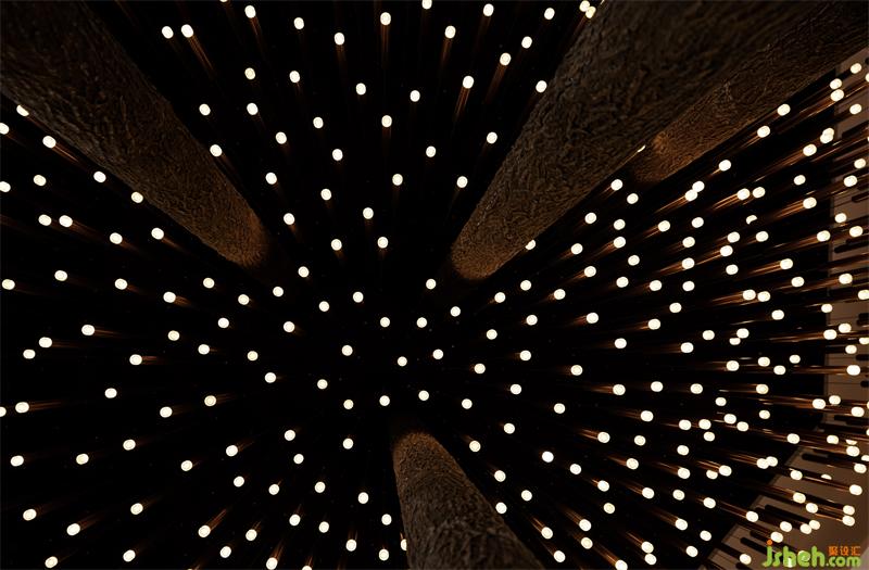 漫天星光点的灯造型装置,以建筑的语汇创造了一个独立的主题式星空森林,形成空间的第一重感官印象,窥探着空间。游走在其中,抬头星空,抚摸右侧草中萤火虫。从观和触去感受空间的梦幻感。