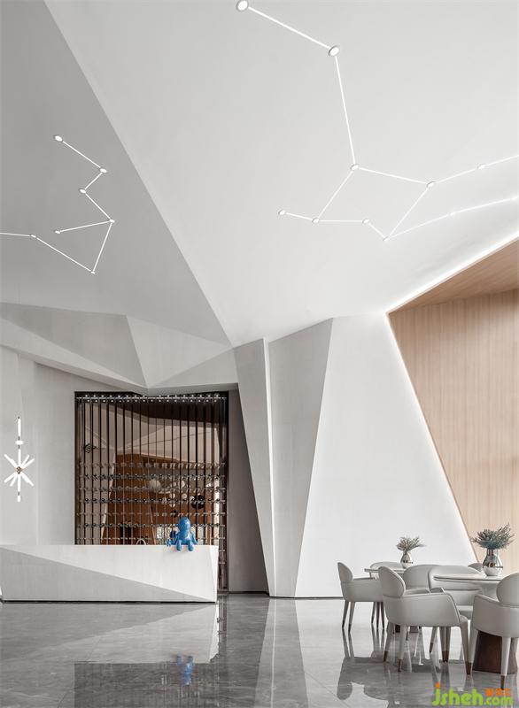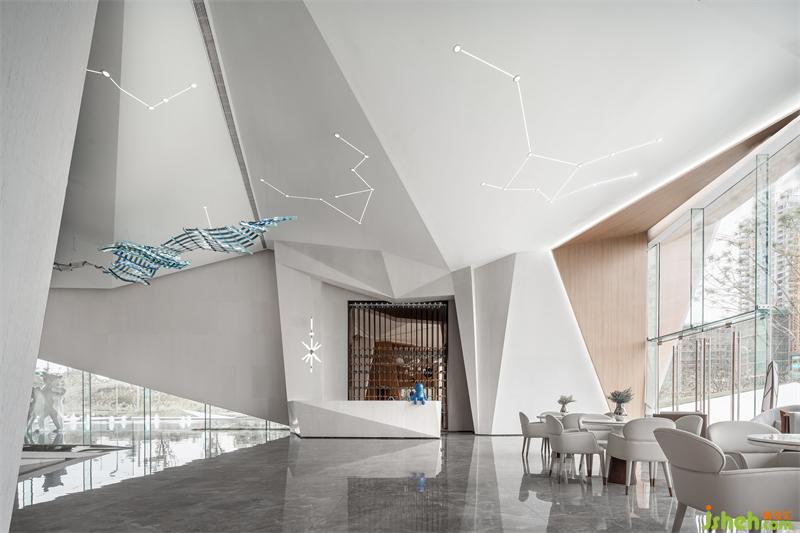售楼处设计抽象构建了一个雕塑性吧台,像是空间长出来的艺术品。打破常规的结构笔触,将这带入了充满想象的宇宙空间中。此时它在结构、线条和色彩变化中,空间与这室内一样,自成风骨。
