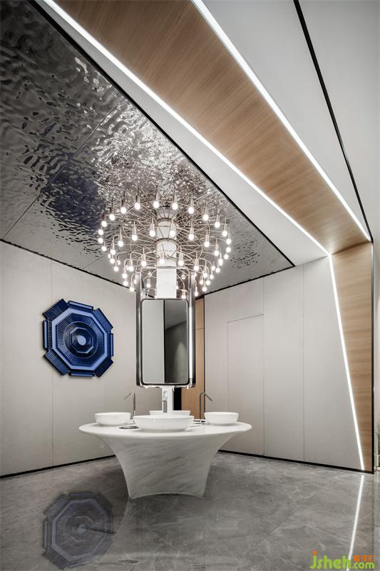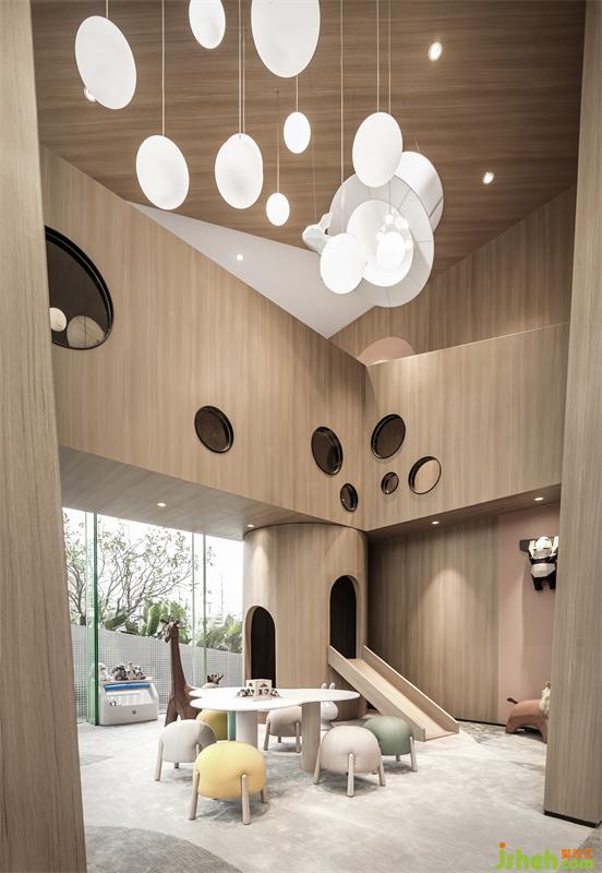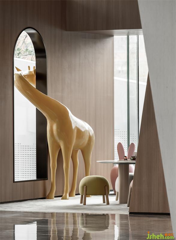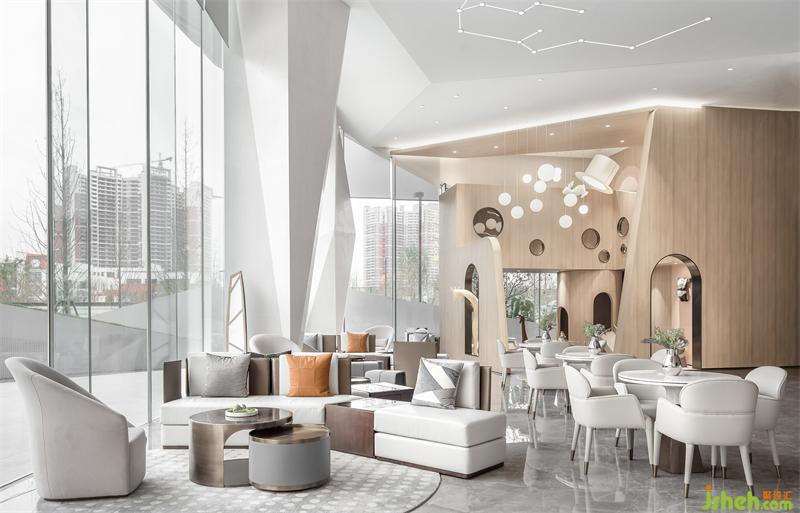 儿童区造了一所半开半闭的小房子,让序列呈现的几何体门洞充盈视觉画面,积木游戏的场景思维试图打破档次与阶层的障碍。故事基调是:售楼处设计找寻星河深处的那片爱丽丝梦游仙境,以魔幻为主题,悬挂在空中的魔法师礼帽突然有了魔法,兔子和梦幻气泡钻出营造奇幻世界,带给人们感官惊喜。