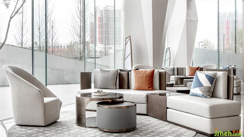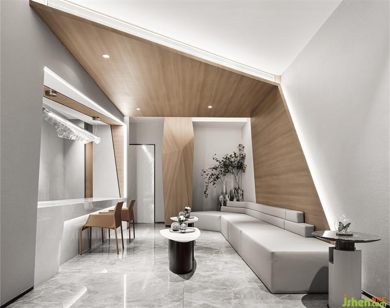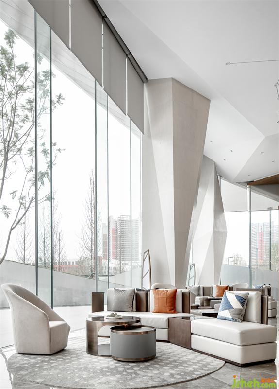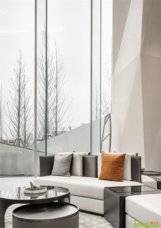 大轮廓建筑感手法的构建,映衬下完成一次空间和心境恰到好处的过渡。在一层临窗的洽谈区,材质和色彩都丰富起来。被包裹的几何构成柱子如同升起的山体在空间中耸立、生长,敦实舒适的沙发和视觉中心处构建出都市丛林中安全感十足的休息空间。