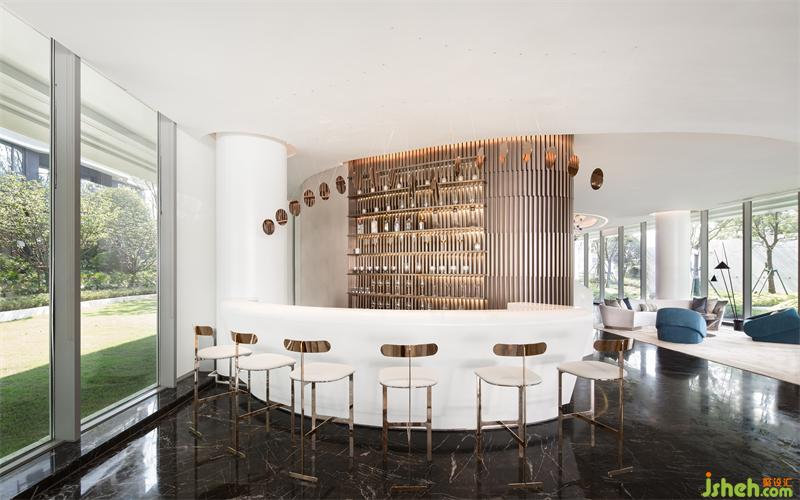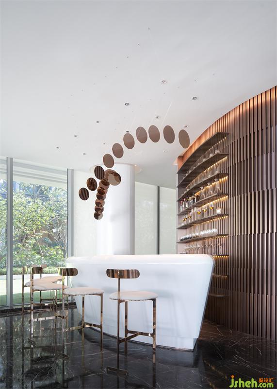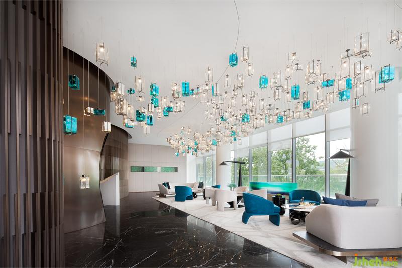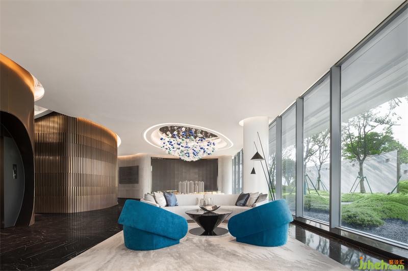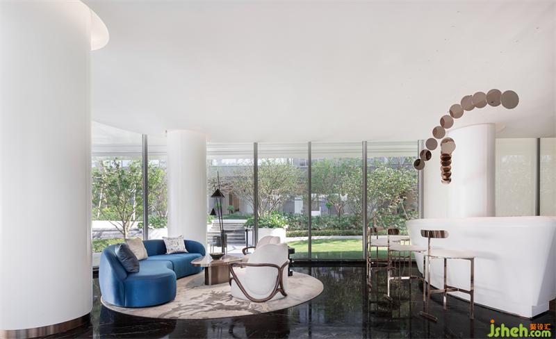 大自然赋予万物变化的形体,湖水涌动仿佛要挣脱空间界定的桎梏。营销中心设计运用西方极简绘画手法将“百湖”的语言改编,转化为艺术装置的形态,恰到好处地表现出空间的视觉张力。