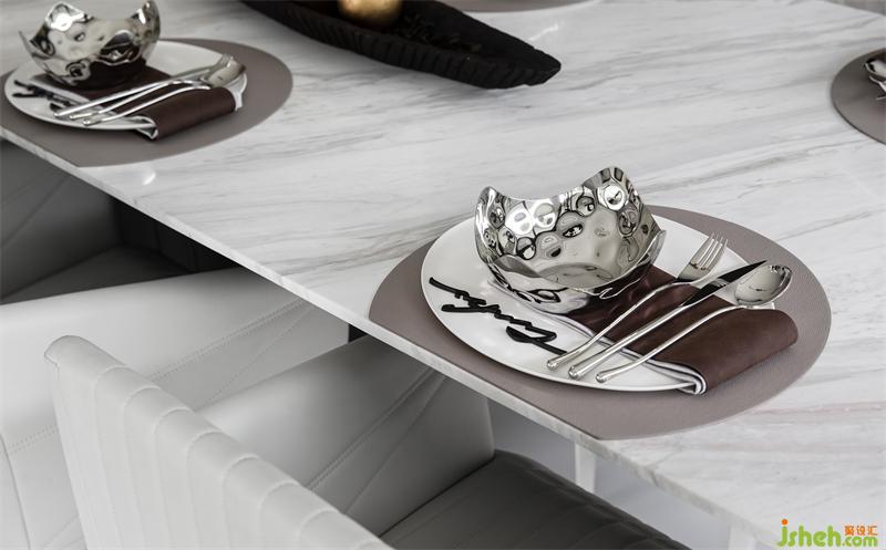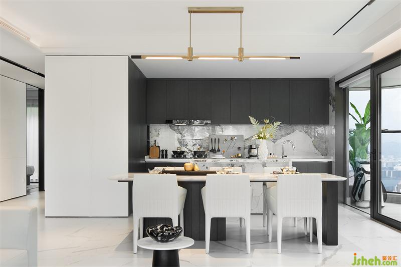 餐厅空间删繁就简,考虑空间设计的本质,将水吧与餐桌相结合,在现代风格的皮质餐椅下,展出着自由艺术的美感。