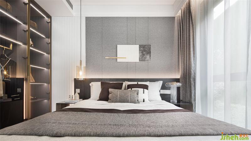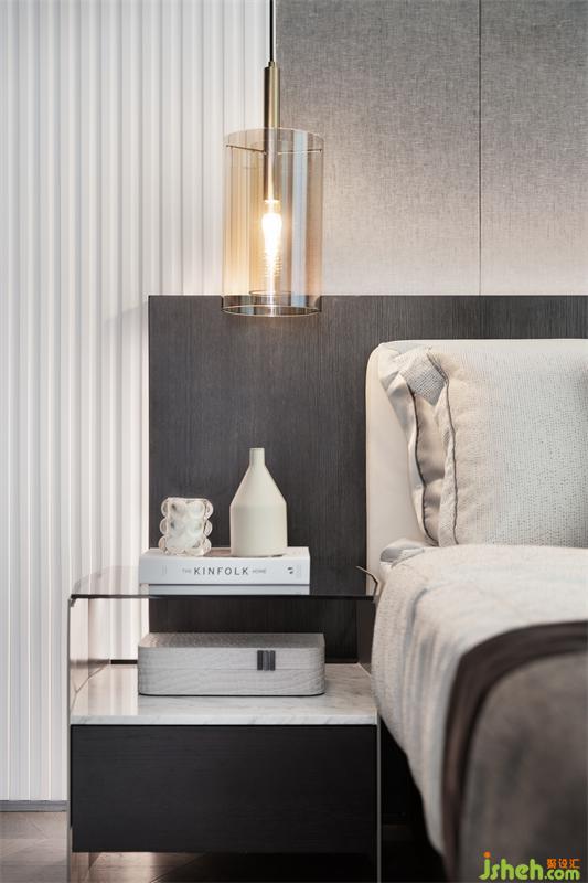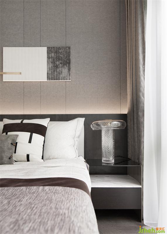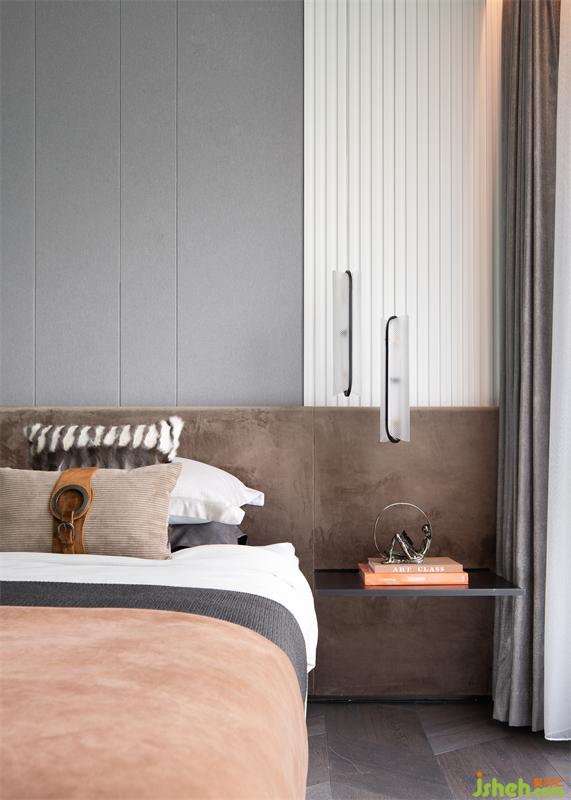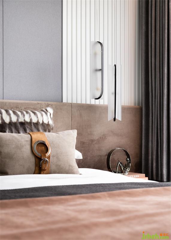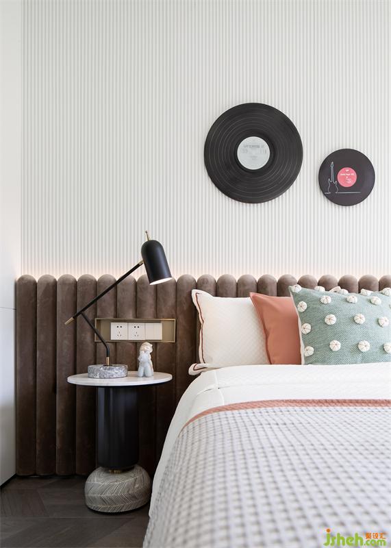 趋近于自然的沉稳色调从主卧空间中展开,同时注入了浓郁的艺术气息,胶片设计的墙面装饰,透露出不拘与灵性。灯饰、柜几等软装陈设在不规则异变中形成新的美学秩序,让音乐与艺术的气息尽情弥漫