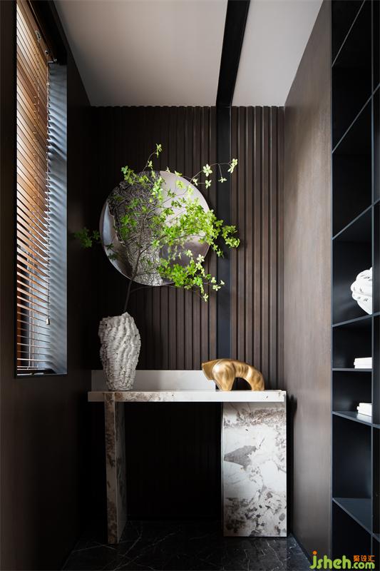 玄关处深色的木饰面与黄铜元素共同演绎复古风华,雅中见致,灵中见韵,唤起当代人的文化自信。